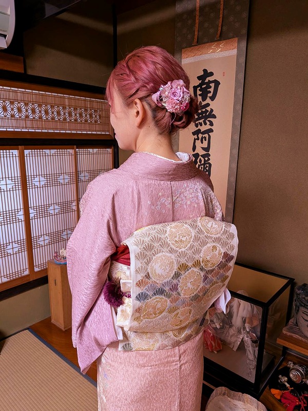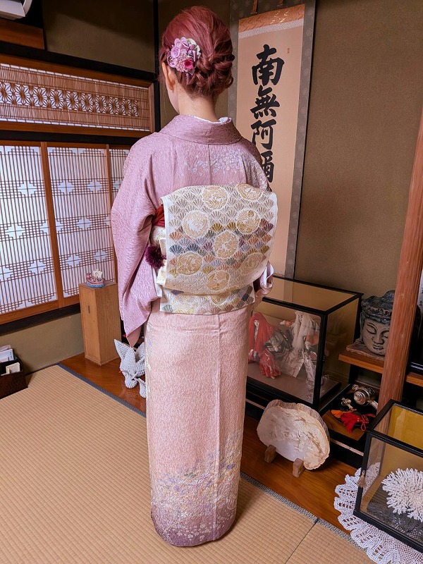 お選びになったのは、優しいピンクの訪問着に上品な袋帯のコーディネート
