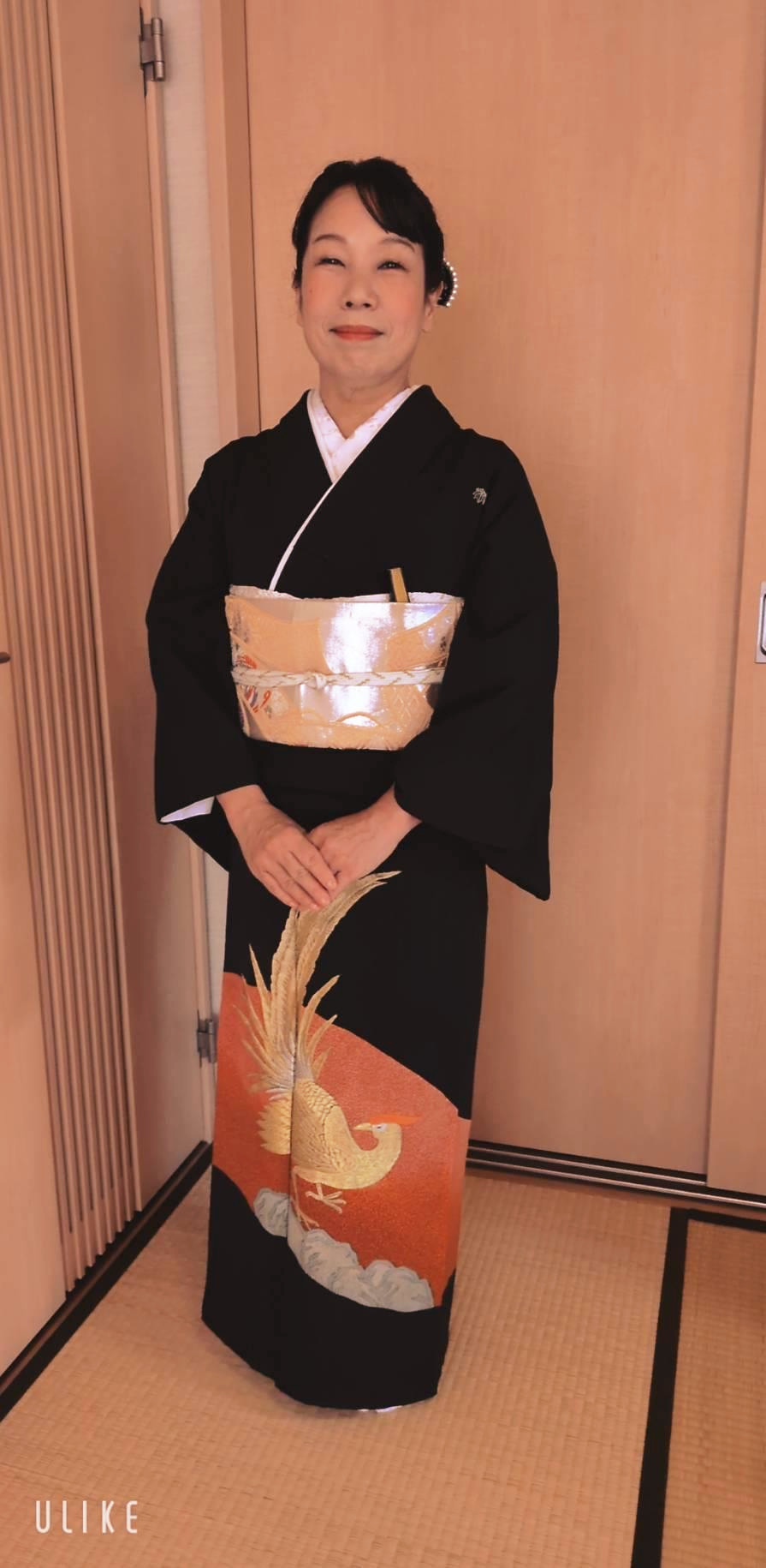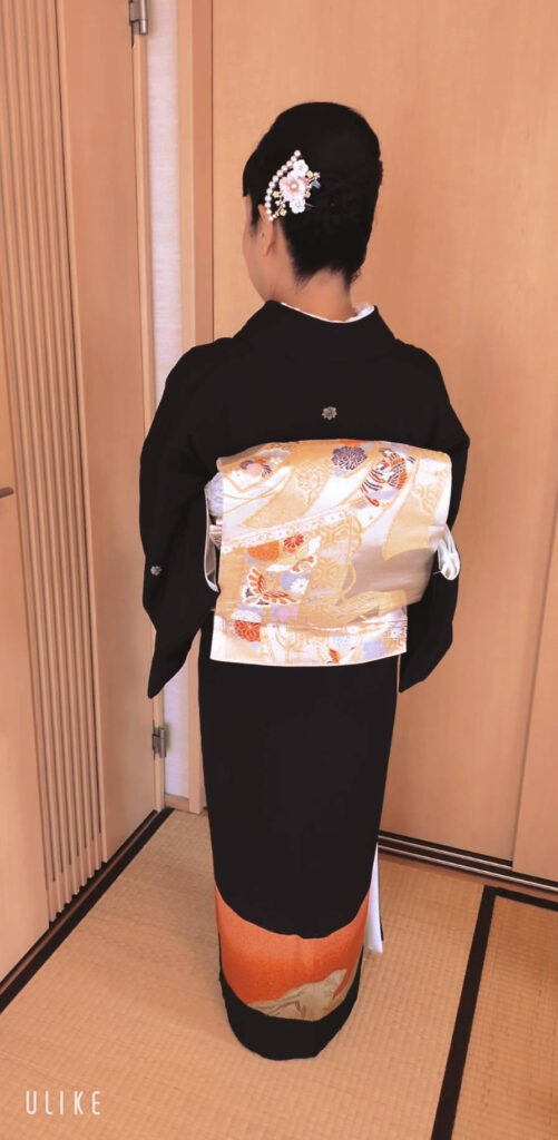 黒地に映えるお着物は、裾模様にあたたかみのある意匠が施され、